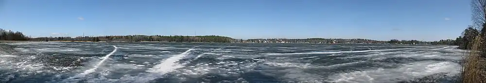 Approximately half of the catchment area is occupied by the settlements and roads of Älta, located within Nacka, with the remaining area composed of forests, wetlands, and smaller patches of open terrain. In the northern part, forming the southern part of the open-air area, is a deciduous hardwood forest. South of the lake is the traffic route Tyresövägen receiving some 20,000 vehicles per day, and west of the road is a speedway track.[7]