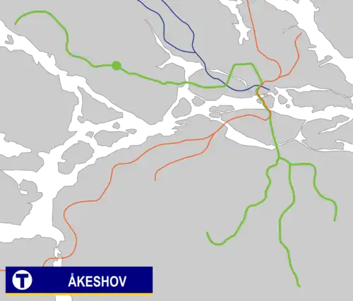 Åkeshov is a station on the Green line of the Stockholm metro. It is located in the borough of Bromma in the west of the city of Stockholm. The station is at ground level, has two island platforms flanking three through tracks, and is one of the intermediate termini along the northern section of the Green line, with line 17 trains normally terminating. Access is by way of a pedestrian underpass that passes under both the metro line and the adjacent Bergslagsvägen street.[2][3][4]