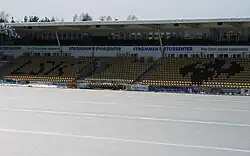 Åråsen Stadion has a capacity of 10,540 spectators. The stadium consists of four single-tier stands.[15] The western stand is the main stand, with the upper section consisting of luxury boxes and club seating for 700 people.[15][16] For sponsorship reasons, it is known as the Romerike Sparebank Stand, after a local bank. The southern part of the East Stand houses the Kanarifansen, the official LSK supporters' group, while the northern part holds the away supporters. The South Stand is named for Romerikes Blad, the local newspaper, while the North Stand is named for Puma, the current sportswear manufacturer.[15] The stadium is owned by Åråsen Stadion AS, which is fully owned by Lillestrøm SK. Operation of the venue's commercial properties is done by Åråsen Eiendom AS, which is 75 per cent owned by Åråsen Stadion and 25 per cent by Romerike Sparebank.[12] The stadium is within walking distance of both the town centre of Lillestrøm and Lillestrøm Station.[17] Lillestrøm SK holds their training sessions in the nearby Lillestrøm Stadion and LSK-Hallen.[18][19] Since 2012 the Norway national football team has been using Åråsen and Lillestrøm stadion for training, largely due to not using an artificial turf, in addition to the near proximity to Oslo and the airport at Gardermoen.[20]