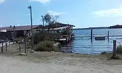 The lagoon is well preserved, with very little urbanization. It has long been used for traditional fishing and for oyster farming, although the shellfish farming was suspended in 2016 due to infection with ostreid herpesvirus 1. It is not used for recreational boating, but visitors fish or swim from the beach, and drive all-terrain vehicles on the dunes despite the extreme damage they cause to the environment. There is a busy restaurant on the south of the peninsula. The watershed has some agriculture with cultivation of grapes, citrus and olives, and extensive livestock farming. Most urbanization is along the National 197 road. The lagoon is used as a water source for aerial firefighting when there is a forest fire in the region.[4]