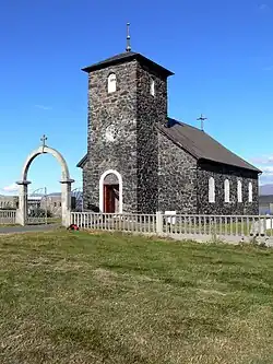 Ásgeir Einarsson (1809–1885) was largely responsible for the church's construction. Einarsson was a local farmer and a member of the Icelandic Parliament ( Alþingi). Construction of the church took 13 years and required transporting stone from Nesbjörg throughout the winter of 1864–65, by sled over the ice-covered lake Hóp on an 8-km journey. Stonemason Sverrir Runólfsson assisted with the planning and built the church walls. Each stone used was put in stowage or tied down and also glued with chalk, and the stones have not moved to this day.[3][4]