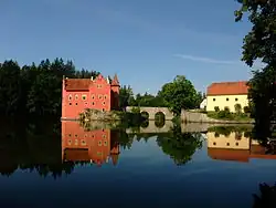 Červená Lhota (German: Roth-Lhotta) is a Renaissance castle in the South Bohemian Region, Czech Republic. It lies in the village of Červená Lhota in the Pluhův Žďár municipality, about 20 kilometres (12 mi) northwest of Jindřichův Hradec. It stands at the middle of a lake on a rocky island. There is also a park, where the Chapel of the Holy Trinity is located.