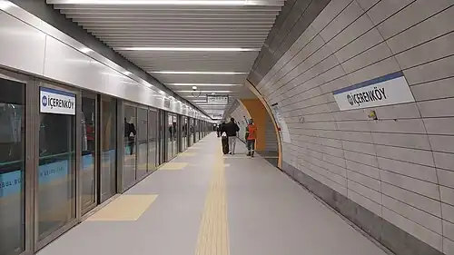 İçerenköy is an underground station on the M8 line of the Istanbul Metro.[1][2] It is located on Kayışdağı Street in the Küçükbakkalköy neighbourhood of Ataşehir. It was opened on 6 January 2023.[3]