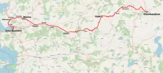 The İzmir–Afyon railway (Turkish: İzmir–Afyon demiryolu) is a mostly single-track railway in the Aegean Region of Turkey, connecting Afyonkarahisar[1] to the port city of İzmir. The railway is the main freight and passenger train route from the Aegean region to Central Anatolia. It was built between 1865–90 by the Smyrna Cassaba Railway and is the second oldest railway in Turkey.[2] Today the line is owned by the Turkish State Railways.