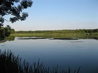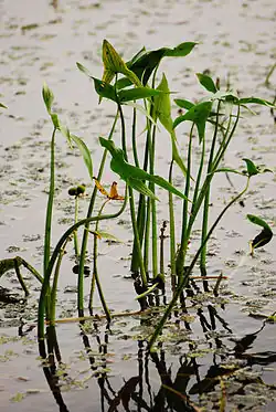 The ponds are overgrown with plants that have submerged rhizomes and roots, including common reed, bulrush, sweet flag, simplestem bur-reed, American waterweed, and arrowhead.[18] Another group consists of plants rooted to the bottoms of water bodies with leaves and flowers floating on the water’s surface, such as longroot smartweed, white waterlily, yellow water-lily, bladderwort, and the tertiary relict water caltrop.[18] Additionally, freely floating plants such as floating fern, European frog-bit, and duckweed can be observed.[6][10] The last group includes underwater plants, such as hornwort, soft hornwort, Eurasian watermilfoil, and American waterweed.[6]