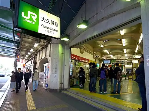 Near the station, Okubo-dori (Okubo street) and surrounding side streets are lined with shops selling Korean food and pop-culture items. Also in the vicinity are Korean-themed bars, nightclubs, and restaurants.[1]