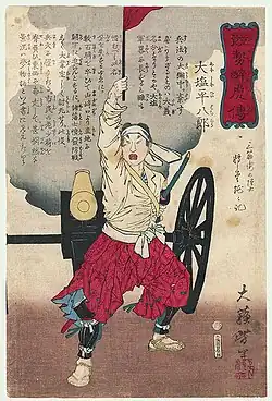 Ōshio Heihachirō (大塩 平八郎; March 4, 1793 – May 1, 1837) was a Japanese philosopher, revolutionary, writer, and yoriki who led the Wang Yangming school (陽明学, youmeigaku) in Osaka. Despite his privileged status, he led a brief uprising against the Tokugawa shogunate.