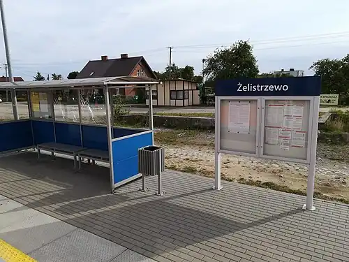 Żelistrzewo railway station is a railway station serving the village of Żelistrzewo, in the Pomeranian Voivodeship, Poland. The station opened on 15 December 1898 and is located on the Reda–Hel railway. The train services are operated by Przewozy Regionalne.