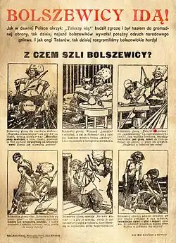 According to Joanna Michlic, "the image of the secularized and radically left-wing Jew who aims to take over [the country] and undermine the foundations of the Christian world" dates to the first half of the 19th century, to the writings of Julian Ursyn Niemcewicz and Zygmunt Krasinski; by the end of the 19th century it had become part of the political discourse in Poland.[31] The phenomenon, described with the term Żydokomuna, originated in connection with the Russian Bolshevik Revolution and targeted Jewish Communists during the Polish–Soviet War. The emergence of the Soviet state was seen by many Poles as Russian imperialism in a new guise.[15] The visibility of Jews in both the Soviet leadership and in the Communist Party of Poland further heightened such fears.[15] In some circles, Żydokomuna came to be seen as a prominent antisemitic stereotype[32] expressing political paranoia.[15]