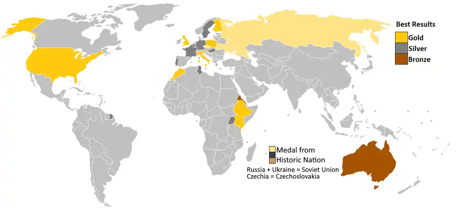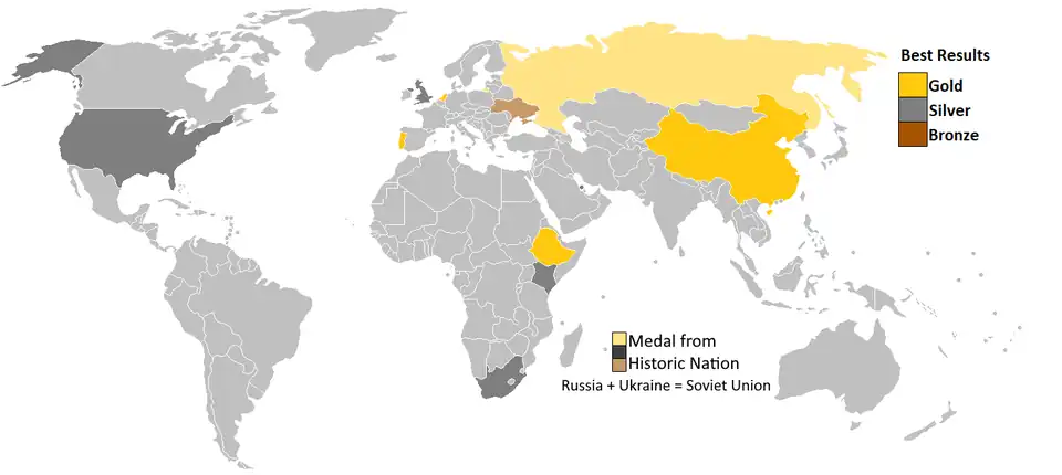 At the 2024 Olympic Games in Paris Joshua Cheptegei won gold in the 10,000 metres final, in a new Olympic Record of 26:43.14.[2] Ethiopia is the most successful nation in the event, with ten gold medals among its total of 24. Finland is the next most successful, with six gold medals and thirteen overall. Finland's period of great success in early 20th century led to wide usage of the nickname the Flying Finns; Kaarlo Maaninka was the last Finnish athlete to medal over 10,000 m, in 1980 (Martti Vainio finished second in 1984 but was disqualified for doping). Kenya has won eleven medals, although Naftali Temu is the only Kenyan to have won Olympic gold.