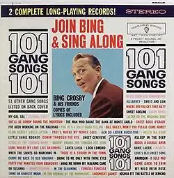 101 Gang Songs is an LP recorded in December 1960[1] by Bing Crosby for his own company, Project Records, and distributed by Warner Bros. (W 2R-1401) and the RCA Victor Record Club in 1961 with lyric sheets to help the listener join in with the singing. Spread over two records, the album consists of 24 medleys of 101 old songs (hence the album's title) in a sing-along format. ("Gang" is meant in the sense of a group of friends, not a street gang or work gang.) Crosby sings on most of the tracks. Those that aren't are marked with an asterisk. The chorus and orchestra accompaniment, arranged and conducted by Jack Halloran, was pre-recorded with Crosby over-dubbing his vocals.