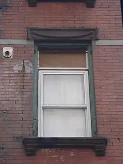The five-story, four-bay running-bond brick tenement building at 109 Washington Street was constructed in 1885 to be a residential structure that extends nearly all the way back to its rear lot line. The original windows were most likely three-over-three double-sash windows and have what appear to be molded brownstone sills and lintels with neo-Classical inspired swags reliefs. The painted sheet-metal, neo-Grec cornice held up by projecting brackets has a matching sheet-metal belt course just below the cornice; both are painted a brown color to resemble the cast iron window trim. These architectural details were most likely purchased from builder's yards but the subtle swag detail and the use of decorative finishings on the windows, as opposed to lintels and sills with no ornamentation at all, indicates at least some desire to provide ornamentation on the façade.[29] A belt course of slate or bluestone runs through the upper edge of the windows on each floor, and a fire escape on the façade of the building has been extant on the building beginning some time prior to 1907; the current fire escape was most likely preceded by another one, due to holes in the masonry of the facade where the previous escape would have been attached. The fire escapes were typically used to air out bedding, dry laundry, or store large items such as basins or baths.[30]