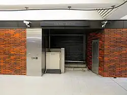 The station was initially built without an elevator between the mezzanine and street level because the city of Oakland refused to allow elevator kiosks on the sidewalks.[17][18] By late 1973, it was the only BART station without an elevator completed or under construction.[17] A surface elevator near 11th Street, set back from the sidewalk on a parcel being redevelopment, was ultimately built as part of a $1.47 million modification to the station. Constructed as part of the City Center development, it also included additional escalators and a new entrance from the City Center plaza. The United States Department of Transportation awarded $1.17 million for the project in April 1974, and a construction contract was issued that December.[19][20] The elevator and new entrance opened along with the plaza and the Clorox Building on October 15, 1976.[21][22][23] A second elevator was added in Ogawa Plaza in 2002.[24]