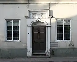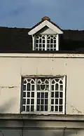 The main entrance, in the Gothic style, dates from the late 18th century.[1][8] Stone steps lead to the door, which is headed by an ogee-arched moulding, with paired quatrefoil decorations above surmounted by a cornice.[1] Nikolaus Pevsner describes the entrance as "pretty".[19] This entrance is flanked by 17th-century casement windows; there are three casement windows on the first floor and three gabled dormer windows with casements, dating from the late 17th century. All the casements have a lattice of small panes, headed by a circular pattern.[1][8] The three first-floor casements contain old stained glass displaying the Crewe and Mainwaring coats of arms.[4][20][21] The main section of the house also has four sash windows to the ground floor, dating from the late 18th century.[1][8]