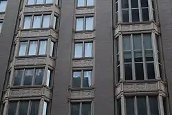 The twelve upper stories are similar in design to each other and contain several types of windows.[15] The windows in the outermost wide bays, and on the third through tenth stories of the center bay, project slightly from the facade and contain trapezoidal frames. The outermost bays contain double-height windows.[15] These double-height windows were designed to maximize sun exposure.[10] The windows in the narrow bays, and in the eleventh through fourteenth stories of the center bay, do not project. In all bays, there are geometric white-painted spandrels between the windows on each story, and the windows have white mullions.[15] The original design contained a metal cornice above the fourteenth story, matching that of 130 West 57th Street, but the cornice was removed sometime in the 20th century.[14]