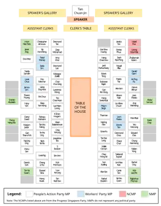 1. ^ 93 MPs were elected in the 2020 Singaporean general election. There are six vacant seats at dissolution.
