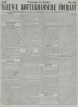 Front page of the Nieuwe Rotterdamsche Courant (NRC) of October 24, 1849, with the anonymous letter about the progress of the formation in the right column.