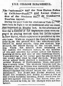 Other schools, such as Yale[6] and Harvard,[7] banned the game outright. On 31 October, a Yale student was arrested after a group of sophomores were caught playing football on New Haven Green.[8] Following the arrest, a group of 200 students gathered outside the police station and one student, Arthur Watson, was seriously injured after being clubbed over the head by a policeman (Officer Kelly). A committee of students complained to the Police Commissioners who split 2–2 (the Mayor abstained) on bringing charges against the officers.[9]