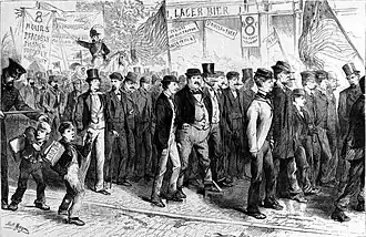 In 1867, the eight hour day was made law in New York, but was largely unenforced. Thus having little effect, and causing resentment among workers. Seeing the results of the Chicago general strike of 1866 for the eight hour workday, which was crushed by local militia, police and hostilely covered by press of the time;[5] New York City workers initially avoided a strike for its enforcement and instead tried to apply pressure within the legislative system.[5] 1870 was also a time of recession which was followed by an anti-union offensive by employers, but NYC unions survived the attack biding time.[6]