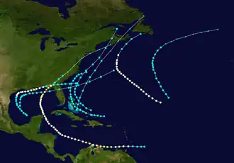 The track for the first known storm begins on August 1 near the Turks and Caicos Islands and ends after the cyclone struck New Brunswick four days later.[3] Three people drowned after that cyclone sank the schooner Vanname.[6] September featured four systems, three of which intensified into hurricanes.[3] High tides, heavy rainfall, and strong winds from the season's storm produced almost $500,000 in damage in Texas and Louisiana.[7] Later in September, the season's fourth cyclone caused devastation in areas throughout its path, inflicting more than $2 million in damage and at least 84 deaths, mostly on Curaçao.[8][9] Two tropical storms are known to have existed in October. The eighth and final cyclone of the season is estimated to have developed by November 28 near Exuma in the Bahamas. Moving northeastward, the system transitioned into an extratropical cyclone on November 29 prior to crossing Atlantic Canada.[3]