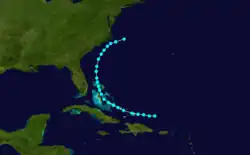 Observations from Cuba and Jamaica indicated that a storm existed to their northeast on September 24.[25] Consequently, the track listed in HURDAT begins about 150 mi (240 km) northeast of the Dominican Republic. The cyclone moved west-northwestward, crossing through the Turks and Caicos Islands and the Bahamas, striking or passing near many islands including Acklins, Crooked Island, and Long Island before turning in a general northward direction east of Andros on September 26. Thereafter, the storm passed near or over islands such as New Providence and Grand Bahama before exiting the Bahamas on the next day. After passing the Bahamas, the cyclone moved parallel to the southeastern coast of the United States and intensified to sustained winds of 60 mph (95 km/h) on September 28,[3] based on reports from the ships Magnolia and Gulf Stream and Cape Henry, Virginia.[10] On September 29, the storm was last noted about 115 mi (185 km) east-southeast of Buxton, North Carolina.[3]