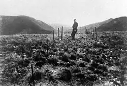 This surveyor stands at a fence that crosses the Hope Fault near Glynn Wye Station. The fence, originally straight, has been kinked by the sideways movement of the land.