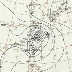 On September 8, a low pressure area formed east of the Philippines. It intensified into a tropical storm while moving to the northwest, passing near the Ryukyu Islands on September 17. After bypassing Taiwan to the north, the storm approached the mouth of the Yangtze in eastern China, before recurving to the northeast. It was last noted on September 21 in the Sea of Japan.[6][16] On the last day of the month, a typhoon formed west of Palau. Steered to the northwest, the storm moved across northern Luzon, hitting Nueva Ecija and Pangasinan. After emerging into the South China Sea, the storm turned to the northeast, brushing the Batanes islands as well as southeastern Taiwan on October 4. Crossing the Ryukyu Islands, the storm was last noted on October 6 to the southwest of Kyushu.[6][17]