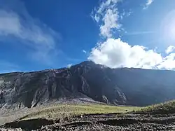Although a caldera did not form, a new, oval-shaped crater had emerged.[5] Karl Sapper reported that three explorers visited the crater in late November. The explorers described a crater with an east-west axis of 1 km (0.62 mi) and was 500–600 m (1,600–2,000 ft) at its widest base diameter. It also extended to a depth of 200–250 m (660–820 ft). The crater floor hosted six vents; the largest was circular and 30 m (98 ft) across, and situated in the center of the crater. The remaining vents were distributed along the edge of the crater and were constantly emitting steam. The second largest of these vents was actively spewing debris some 20 m (66 ft) into the air. A section of the volcano's flank was destroyed, exposing steep cliffs and revealing layers of lava flows and ash deposits extending 1,200 m (3,900 ft) high.[1] This major scarp nearly reached the summit of the volcano. Large pieces of rocks were observed falling and accumulating at the bottom of the scarp in a 150 m (490 ft) debris cone. They also estimated the crater wall's slope to be 60 degrees.[3]