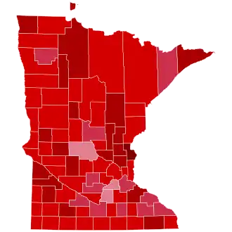 Roosevelt carried all of Minnesota's counties, becoming the first presidential candidate to do so. The only other presidential candidate to sweep all of the state's counties has been Warren G. Harding in 1920.[1] In addition, with 73.98 percent of the popular vote, Minnesota would be Roosevelt's third strongest victory in terms of percentage in the popular vote after Vermont and North Dakota.[2] Roosevelt's 73.98 percent constitutes the best performance by any presidential candidate since Minnesota's statehood in 1858.[1]