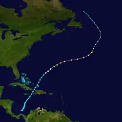 On October 1, a tropical depression developed in the southwestern Caribbean Sea. Moving slowly north-northeastward, it reached tropical storm status early on October 3. The following day, the storm curved northeastward.[2] Kingston, Jamaica, recorded rainfall as the system bypassed the island.[4] Late on October 5 and early on October 6, the storm passed through the Windward Passage.[2] Eastern Cuba was affected "with some force", but damage was not significant.[4] Entering the Atlantic Ocean,[2] the system passed through the southeastern Bahamas and Turks and Caicos Islands without causing damage.[4] While centered about halfway between Bermuda and Turks and Caicos Islands, the storm strengthened into a Category 1 hurricane on the Saffir–Simpson hurricane wind scale.[2]