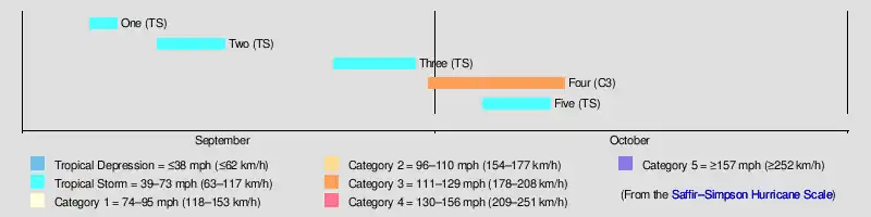 Of the season's five tropical cyclones, only one reached hurricane status, the fewest since 1890. Furthermore, that storm strengthened into a major hurricane, which is Category 3 or higher on the modern-day Saffir–Simpson hurricane wind scale.[1] This storm, which was the fourth and strongest hurricane of the season, peaked at Category 3 strength with 120 mph (195 km/h) winds. It was also attributed to at least six fatalities after sending a rogue wave across the steerage of the steamer Campania. The first storm also resulted in two deaths after a schooner wrecked in Barbados.