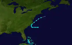 A ship detected a tropical storm about 230 mi (370 km) southeast of Cape Hatteras, North Carolina, at 12:00 UTC on August 30.[1][5] The storm moved westward, until turning northeastward late on August 31. At 00:00 UTC on September 1, the system peaked with maximum sustained winds of 50 mph (80 km/h). Eight hours later, it made landfall near Cape Lookout, North Carolina, at the same intensity. Shortly thereafter, the storm reemerged into the Atlantic Ocean. The system transitioned into an extratropical cyclone at 18:00 UTC on September 2, while located about 135 mi (215 km) southeast of Nantucket, Massachusetts.[1] The storm brought strong winds to portions of North Carolina and Virginia.[5]