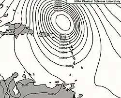 The 1908 March hurricane was initially observed by a ship at 12:00 UTC on March 6 while located about 430 mi (690 km) northeast of Barbuda.[1][5] Tracking in an unusual south-southwest direction, the storm intensified into a Category 1 hurricane on the modern day Saffir–Simpson hurricane wind scale. Shortly before reaching the United States Virgin Islands early on March 8, the hurricane intensified into a Category 2 hurricane,[1] peaking with maximum sustained winds of 100 mph (160 km/h) and a minimum barometric pressure of 984 mbar (29.1 inHg), which was observed outside the center in Nevis.[5][8] Once in the Caribbean on March 8, the system slowly began to weaken, losing hurricane status the following morning. The storm was last noted about 130 mi (210 km) north of Blanquilla Island late on March 9.[1]