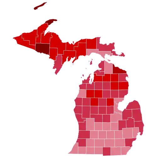 Following the Panic of 1893 and the Populist movement, Michigan would turn from a competitive Republican-leaning state into a rigidly one-party polity dominated by the Republican Party.[2] The dominance of the culture of the Lower Peninsula by anti-slavery Yankees[3] would be augmented by the turn of formerly Democratic-leaning German Catholics away from that party as a result of the remodelled party's agrarian and free silver sympathies, which became rigidly opposed by both the upper class and workers who followed them.[4] The state Democratic Party was further crippled via the Populist movement severing its critical financial ties with business and commerce in Michigan as in other Northern states.[5] A brief turn of the strongly evangelical Cabinet Counties toward the Populist movement in the 1896 presidential election would reverse itself following the return to prosperity under President William McKinley, so that these joined in Republican hegemony until the Great Depression. McKinley would also later beat Bryan in the state again four years later.