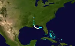 A trough of low pressure in the northeastern Gulf of Mexico developed into a tropical depression about 60 mi (100 km) west-southwest of Cedar Key, Florida, on September 10.[4] Shortly thereafter, the depression intensified into a tropical storm. Moving generally westward, the storm intensified into a Category 1 hurricane on the modern day Saffir–Simpson scale early on September 12. The cyclone peaked with maximum sustained winds of 90 mph (150 km/h) at 00:00 UTC on September 13,[5] observed by a ship.[4] Around this time, the hurricane began to curve northwestward. While approaching the Gulf Coast of the United States, the system weakened. At 08:00 UTC on September 14, the hurricane made landfall near Pascagoula, Mississippi, with winds of 75 mph (120 km/h).[5] A barometric pressure of 986 mbar (29.1 inHg) was observed at landfall, the lowest known in relation to the cyclone.[4] The system quickly weakened to a tropical storm just four hours after landfall. Early on September 15, the storm weakened to a tropical depression and dissipated over Tennessee.[5]