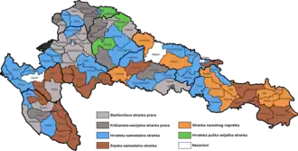 ![]() Results of the election in each of the electoral districts in 8 counties of the Kingdom of Croatia-Slavonia: the party with the plurality of votes in each district. Starčević's Party of Rights Christian-Social Party of Rights Croatian Independent Party Serb Independent Party Unionists Croatian Peoples' Peasant Party Independent | |||||||||||||||||||||||||||||