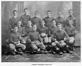 Each of the above players, except members of the class of 1914 (Brackett, Reardon, and Woodman), appeared in a list of varsity letter winners in the school's 1916 yearbook.[14] As the policy of this era was to award varsity letters to 13 players plus the team's student manager,[15] and the 1916 yearbook summarized two seasons of football play (as no 1915 yearbook was published),[16] it is inferred that Brackett, Reardon, Woodman, and Davis also received letters.