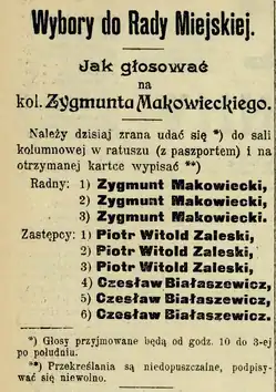 - ^ a b Wybory do Rady Miejskiej, in Goniec Wieczorny, July 11, 1916. p. 3