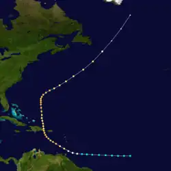 A tropical storm was first observed about 500 mi (800 km) east of the island of Trinidad on September 6. It moved nearly due westward and struck the Windward Islands on September 8 as a Category 1 hurricane. The storm moved northwestward across the Caribbean and intensified into a major hurricane on September 9. Thereafter, the cyclone began to curve northward, and early on September 11, it made landfall in the Dominican Republic near Boca de Yuma at peak intensity as a Category 3 hurricane with winds of 125 mph (201 km/h). The storm weakened to a Category 2 hurricane after striking the island, but re-strengthened into a Category 3 while northeast of the Bahamas on September 13. The storm curved northeastward on September 14 and began accelerated. On the following day, the system weakened to a Category 2 hurricane near Bermuda. Early on September 17, the system weakened to a Category 1 hurricane and soon transitioned into an extratropical cyclone about 310 mi (500 km) east of Newfoundland.[3] The remnants were absorbed by a larger extratropical storm later on September 17.[4]