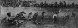 The teams first met on October 23, 1920,[6] at Harvard Stadium in the Boston neighborhood of Allston.[19] Entering the game, both teams were undefeated and untied and neither Centre, in three games, nor Harvard, in four, had been scored on.[6][20] Centre's team was called "the scoring machine of the football universe" by The Dayton Herald after totaling 241 points in their first three games combined.[20][21] Attendance was estimated by The Dayton Herald to be at least 37,000 people (and was reported to have been as high as 45,000[22]). Ticket sales were stopped the night before when the contest sold out and as many as 10,000 potential attendees were turned away at the gates as a result.[21][23] In contrast, Centre had never played before a crowd exceeding 8,000 fans.[24] Harvard was favored to win the game with 8-to-5 odds and had, on average, a 22-pound weight advantage over Centre's squad.[21] Centre president William Arthur Ganfield traveled to attend the game and led the team in prayer before they took the field.[21]