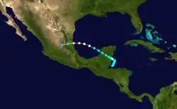 The third tropical storm of the season (initially classified as two separate storms but later identified as a single track) was first observed on July 14 near St. Kitts. It moved quickly westward and passed just south of Puerto Rico and Hispaniola as a weak storm. The system curved slightly to the west-northwest and brushed the northern coast of Jamaica before turning slightly westward and hitting the Mexican state of Quintana Roo. As it crossed the Yucatán Peninsula the cyclone weakened and eventually crossed into the Bay of Campeche. It moved quickly to the northwest, and made landfall near Matagorda Bay, Texas, on July 23 as a 45 mph (72 km/h) tropical storm. The system turned to the northeast, and became extratropical to the east of Dallas. The extratropical system moved slowly through northern Louisiana, turned to the northeast, and dissipated over northeastern Arkansas near Memphis, Tennessee.[10][17]
