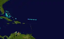 On September 7, a ship reported southwest winds at a location about 405 mi (650 km) northeast of Antigua, indicating the presence of a tropical cyclone. The storm tracked to the west-northwest without strengthening, and the following day no circulation was reported. It is estimated the storm weakened to a tropical depression and dissipated on September 8 while located about 235 mi (380 km) north-northeast of Saint Martin, although it may have remained a tropical depression throughout its short lifespan.[9] The storm never affected land.[1]