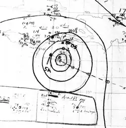 On August 16, 1944, decreased pressures just east of Barbados were indicative of a passing tropical storm.[1][2] The storm's first entry in the official Atlantic hurricane database lists the system as already possessing winds of 50 mph (80 km/h);[3] the Atlantic hurricane reanalysis project noted that the possibility that the tropical cyclone forming east of the Lesser Antilles remains ambiguous due to a lack of observations over the open Atlantic. Not long after its first detection, the tropical storm intensified into a hurricane on August 17 as it crossed into the Caribbean Sea near Grenada. Gradual intensification took hold as the storm progressed west-northwestwards across the Caribbean.[2] A ship en route to Buenos Aires, Argentina crossed the eye of the hurricane 180 mi (290 km) south of Puerto Rico the following day, recording a central pressure of 973 mbar (hPa; 28.73 inHg); this was the lowest pressure measured in connection with the storm.[4] On the following day, the small tropical cyclone strengthened into the equivalent of a Category 3 hurricane on the modern Saffir–Simpson hurricane wind scale, making the storm a major hurricane.[2]