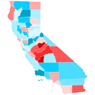 Despite the polls, Douglas was confident that the Democratic registration edge would lead her to victory, so much so that she offered a Roosevelt staffer a job in her senatorial office.[104] On election day, November 7, 1950, Nixon defeated Douglas by 59 percent to 41.[105] Of California's 58 counties, Douglas won only five, all in Northern California and with relatively small populations;[j][106] Nixon won every urban area.[107] Although Warren defeated Roosevelt by an even larger margin, Nixon won by the greatest number of votes of any 1950 Senate candidate. Douglas, in her concession speech, declined to congratulate Nixon.[105] Marcantonio was also defeated in his New York district.[108]