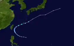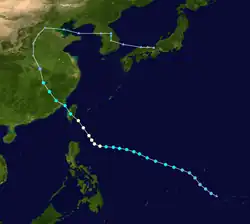 On June 25, Kit formed just south of the Philippines. Over the following days, the storm traverses west, then later northwest, having peak intensity on June 29. Kit later starts decreasing speed on July 1, then made landfall in Taiwan on July 3. The next day, Kit settles in China, curving north. The storm stayed in China over the following days, then made landfall on the Korea peninsula on July 5. The storm later makes landfall in Japan on July 7, then dissipated the following day.[6] Because of the storm, strong winds were recorded in Batanes, with widespread precipitation.[7] Other than rain, Kit destroyed a ship and damaged another.[8]