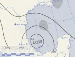 A weak disturbance was first observed near Grand Cayman on August 23.[4] The disturbance moved northeastward into the Gulf of Mexico, where it became a tropical depression late on August 25. Early the next day, the depression intensified into a tropical storm. The tropical storm marginally strengthened further, peaking with maximum sustained winds of 45 mph (72 km/h) by 0000 UTC on August 27. Nearing the Gulf Coast of the United States, the system curved towards the west.[7] The storm maintained its intensity up until landfall in Louisiana near New Orleans about four hours later.[4] Moving inland, it slowly weakened while crossing the Central United States, degenerating to tropical depression strength by August 28 and dissipating over east-central Texas several hours later.[7]
