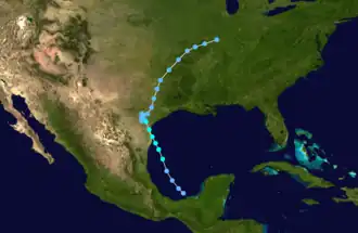 The depression gradually strengthened, and by 0600 UTC on June 23, it reached tropical storm status.[2] Over Texas, airborne radars and the Dow Chemical Company radar in Freeport indicated curved convective banding associated with the storm. Though no wall cloud was reported, the Kelly Air Force Base reported a cloud center.[1] The storm continued to intensify, peaking with winds of 60 mph (97 km/h) by 0000 UTC on June 24.[2] At 0400 UTC that day, the tropical storm made landfall near Corpus Christi, Texas.[1][2] After moving inland, the storm quickly weakened back to a tropical depression. Over the following 24 hours, the depression executed a small cyclonic loop over southern Texas. On June 26, the depression accelerated to the north-northeast, and eventually dissipated over northern Illinois on June 29 at 0000 UTC.[2]