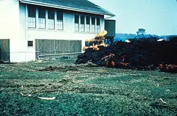 A community of 300 inhabitants, a school, churches, roads, and crops were destroyed and covered by several meters of lava that advanced out to sea, modifying the coastline by bringing Cape Kumukahi, Hawaii's easternmost point, a little further east.[6] After the lava had cooled, Kapoho was not rebuilt, except a few buildings southwest of the site of the former settlement, next to the lava flow.[8] The roads have been retraced, with the coastal road crossing the lava flow from one end to the other and the road to the Cape Kumukahi lighthouse via Kapoho following the old route.[8] Part of the lava flow, notably the mass of tephra formed on January 27, has since been exploited as a slag quarry not far from Koaʻe.[8]