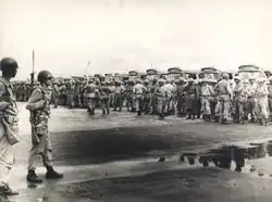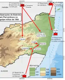 In the countryside, the Peasant Leagues attracted fears.[115] The right saw revolutionary potential in the Brazilian countryman, which served to justify the coup as a defense of legality. Part of the left thought the same, and some members of the Leagues even formed a guerrilla movement, the Tiradentes Revolutionary Movement. The organization received support from Cuba.[116][117] Its discovery and dismantling in 1962 brought repercussion disproportionate to its size.[118] However, the strong reaction that the coup leaders expected in the Northeast did not materialize.[119] In Pernambuco, the outbreaks of peasant reaction that did appear were unarmed.[h]