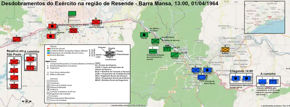 The São Paulo troops had already arrived: at 11:30 the 5th RI approached Resende, staying in the east, at 12:30 the 2nd RO 105, CPOR/SP Battery and 1st Company of the BCCL arrived at AMAN and at 12:45 the 2nd Mechanized Reconnaissance Squadron to Itatiaia.[11][59] According to Colonel Osório, General Aluísio was inefficient in using this squadron, holding it back instead of sending it forward as reconnaissance.[60]